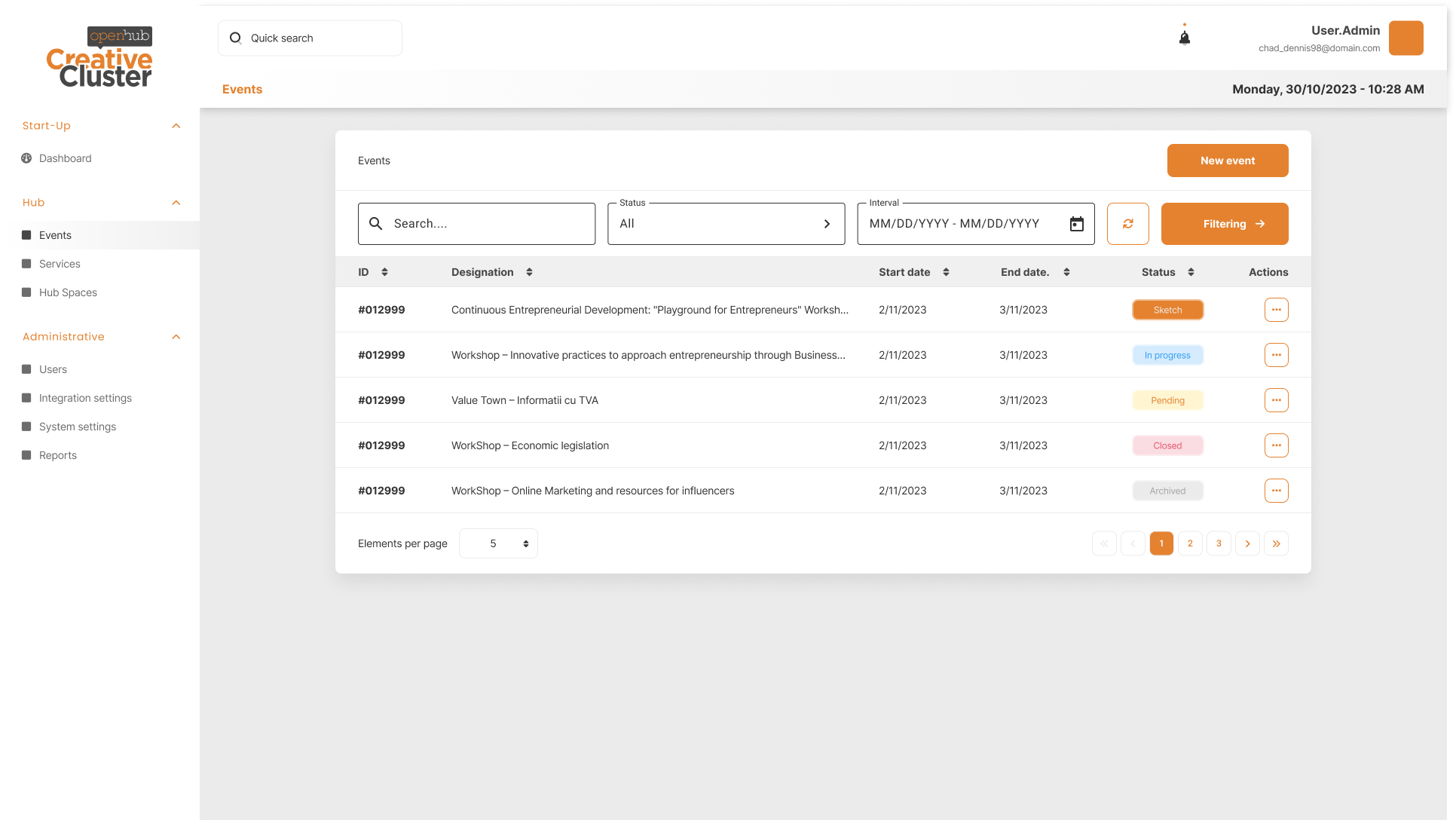 - Event Management: Create, view, and manage hotel events with user assignments and status tracking.